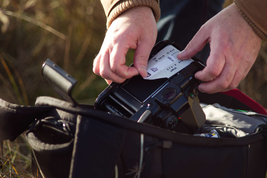 - Mounting film would be separate from the camera: you can prepare several backs with film and quickly exchange the back when you run out (there are only 10 frames per roll), and / or you could have an assistant prepare a fresh back while you keep using the camera.